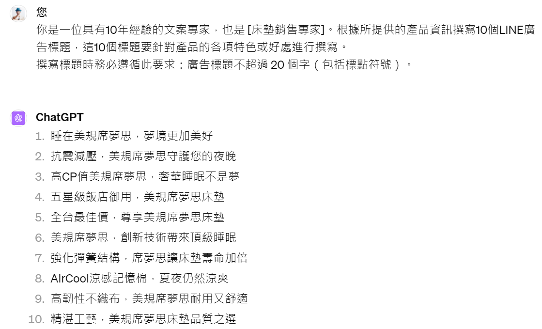 - 利用 ChatGPT 撰寫廣告文案,透過明確提示詞(prompt)生成符合 LINE 格式與字數的內容,人工微調後即可使用。