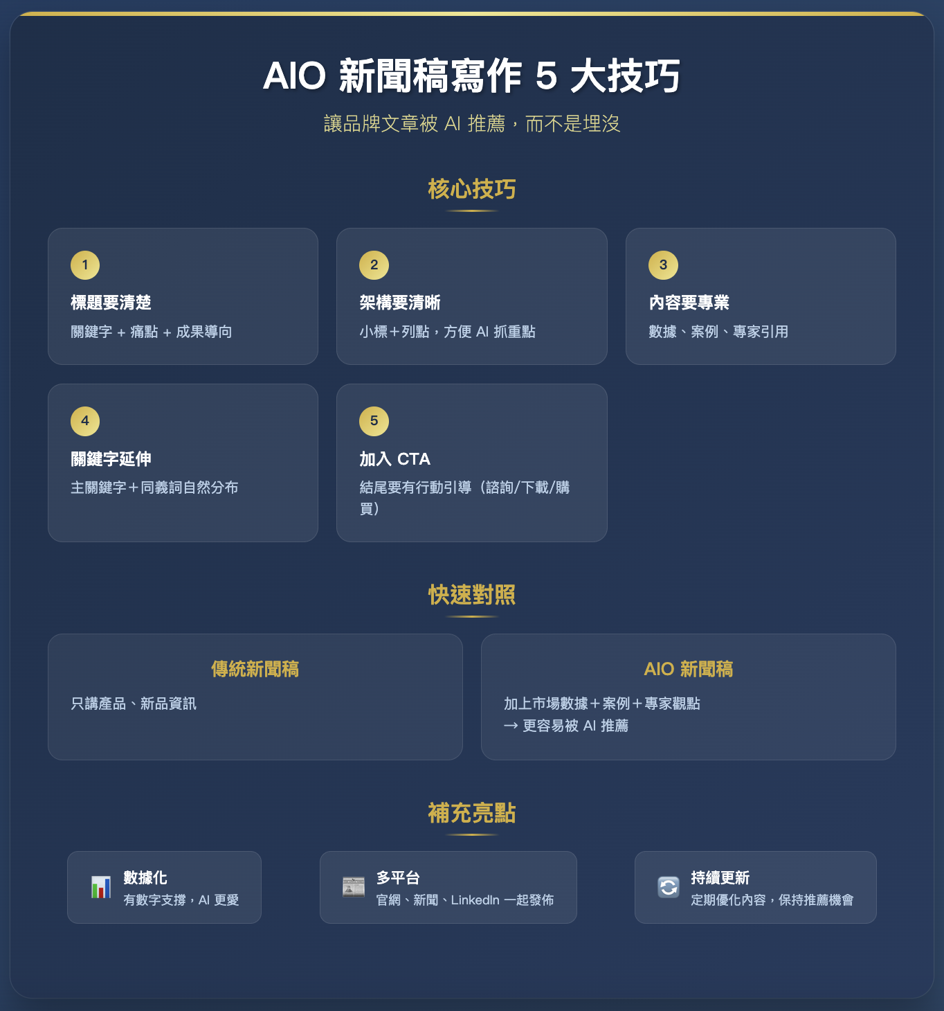 也就是說,AIO 新聞稿不是單純堆疊關鍵字,而是要讓 AI 覺得文章有「專業、數據、可信度」。