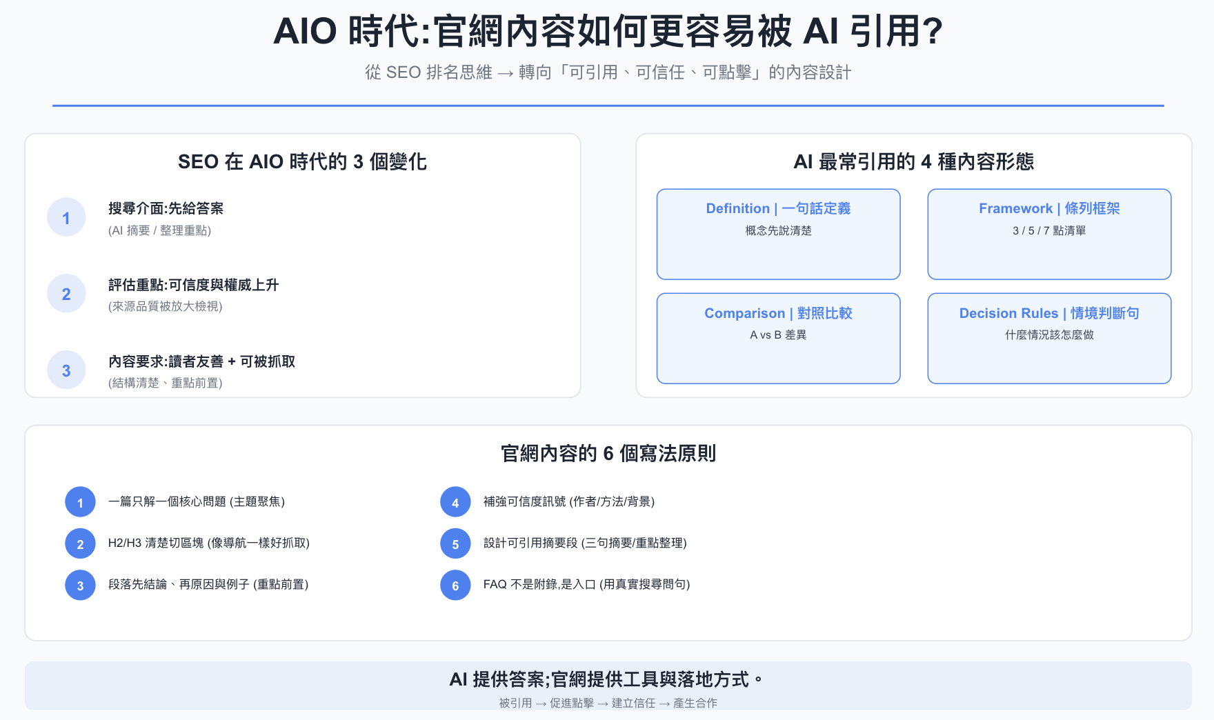 像「三個原則、五個步驟、七個檢核點」這種結構,對 AI 很友善,因為它可以直接拿去組成摘要答案,也讓讀者更容易掃讀。