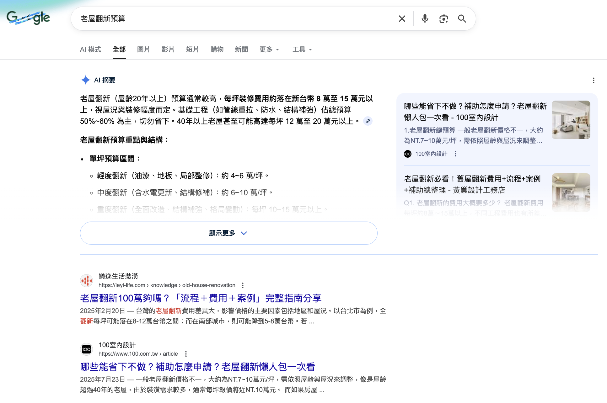 SEO 關鍵字精準佈局:除了通用的「室內設計推薦」,應深耕長尾關鍵字,如「老屋翻新預算」、「小坪數收納設計」、「北歐風裝潢費用」。這些精準關鍵字背後,往往是購買意願極高的準客戶。