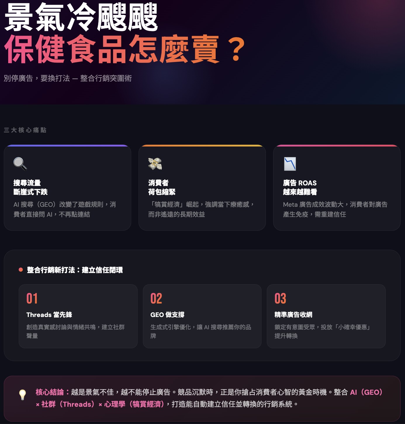 景氣不好是事實,購物氣氛不如從前也是事實。但保健食品市場依舊龐大,只是錢流向了更懂消費者、更懂得利用新型態流量(Threads, AI 搜尋)的品牌。