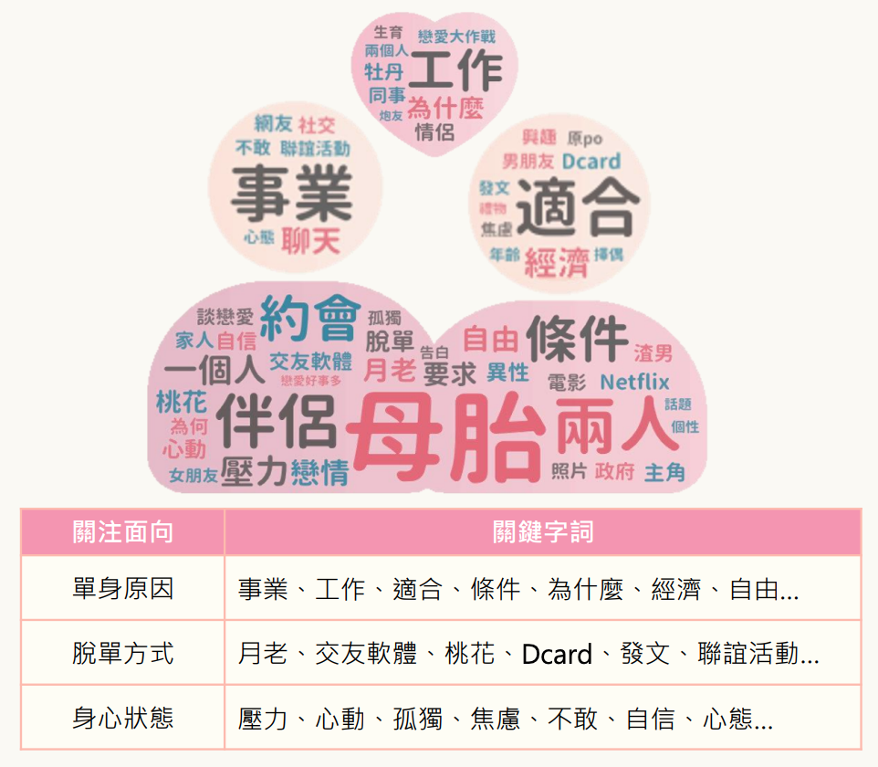 強烈渴望脫單的網友,展現出「求神問卜」與「數位工具」並用的行為趨勢 。關鍵字如「月老」、「桃花」代表心靈層面的寄託 ;而「交友軟體」、「聯誼活動」與「Dcard 發文」則顯示大眾正積極透過多元管道主動拓展交友圈 。