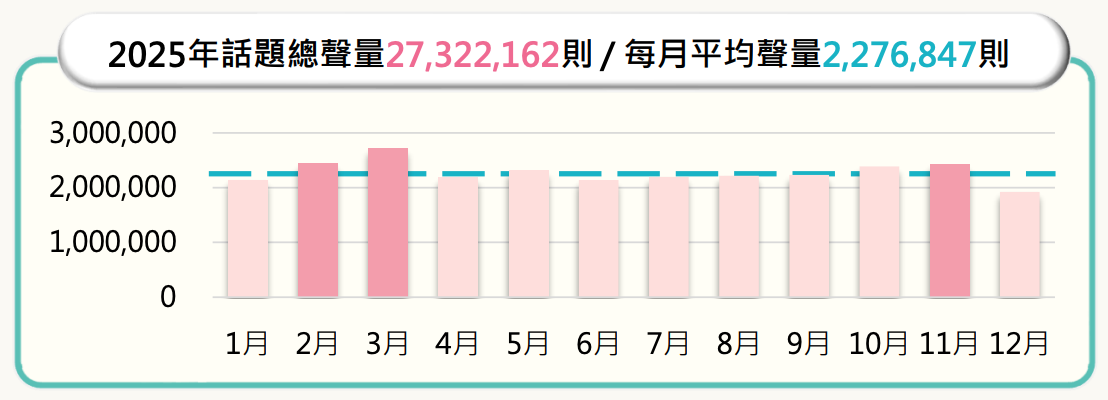 根據 OpView 社群口碑資料庫 的 2025 全年度追蹤,台灣感情相關話題聲量已衝破 2,700 萬則,每月平均產出超過 200 萬則 討論 。然而,這股驚人的聲量背後並非全是甜蜜,更多的是對「不確定性」的集體焦慮。從 2 月的名人婚外情、3 月的網紅分手風波,到 11 月的公眾人物情感爭議,社群情緒不斷被「背叛」與「不忠」洗版 。